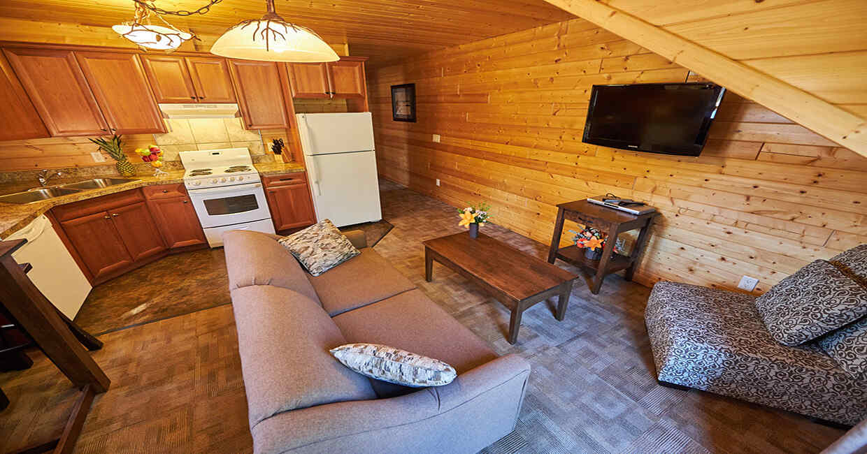Step onto your balcony for your morning coffee and breathe in the fresh Alpine air. After a day of exploring, take a long soak in your jetted tub, catch up over the day’s stories in the plush living room seating area, and then ease into your comfortable bed. The Mountain View Suite boats an apartment layout to relax, unwind and make yourself at home in the heart of The Canadian Rockies. Our Suite features a full kitchen with an electric stove/oven, large refrigerator, dishwasher, kettle, coffee maker, toaster, pots, pans, utensils, flatware and dinnerware.